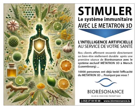 Enfin, la Biorésonance-3D avec le système Metatron n’a pas son pareil pour stimuler le système immunitaire et éviter tant que faire se peut, les infections respiratoires automnales et hivernales. Les résultats, depuis plus de 10 ans que je pratique cette thérapie, sont indiscutables et efficients.