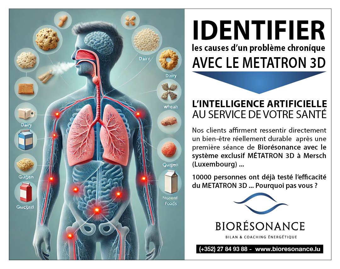 Bioresonance Center est autorisé par le Ministère des Classes Moyennes du Grand-Duché de Luxembourg aux fins d’exercer les activités de bilan et de coaching énergétique, et propose des prestations basées sur les techniques de la biorésonance et de la métatronique. Ces techniques bénéficient des agréments CE et FDA (U.S.A.) ainsi que de l’homologation TUV pour les appareils Métatron utilisés dans le cadre de nos prestations. Bioresonance Center n’a pas vocation à se substituer aux instances médicales habilitées et décline toute responsabilité quant aux conséquences de ses prestations. Bioresonance Center invite expressément ses clients à consulter leur médecin traitant pour toute question relative à un processus thérapeutique les concernant.