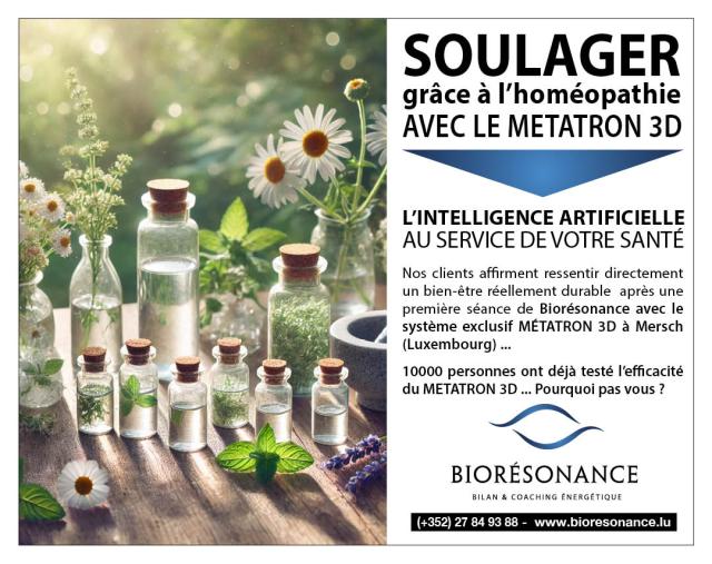 Bioresonance Center est autorisé par le Ministère des Classes Moyennes du Grand-Duché de Luxembourg aux fins d’exercer les activités de bilan et de coaching énergétique, et propose des prestations basées sur les techniques de la biorésonance et de la métatronique. Ces techniques bénéficient des agréments CE et FDA (U.S.A.) ainsi que de l’homologation TUV pour les appareils Métatron utilisés dans le cadre de nos prestations. Bioresonance Center n’a pas vocation à se substituer aux instances médicales habilitées et décline toute responsabilité quant aux conséquences de ses prestations. Bioresonance Center invite expressément ses clients à consulter leur médecin traitant pour toute question relative à un processus thérapeutique les concernant.